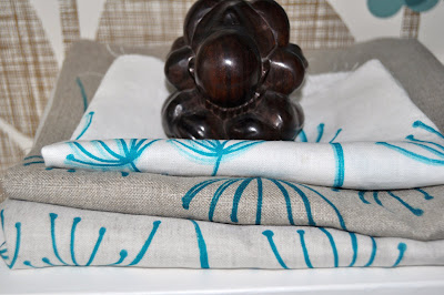 I began with a design that I have used quite a bit in embroidery and set to work by printing on various pieces of linen, just to get the feel for it. I have to say at this point that my, oh so wonderful, teacher had taken all the donkey work out of it and prepared my screen for me and all that was left for me was to play with fabric and ink...perfect!