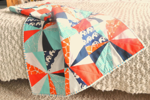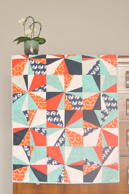 i decided to make a wonky windmill kinda block pairing the umbrella prints with coordinating kona solids. i backed it in a simple solid red, again less was more.