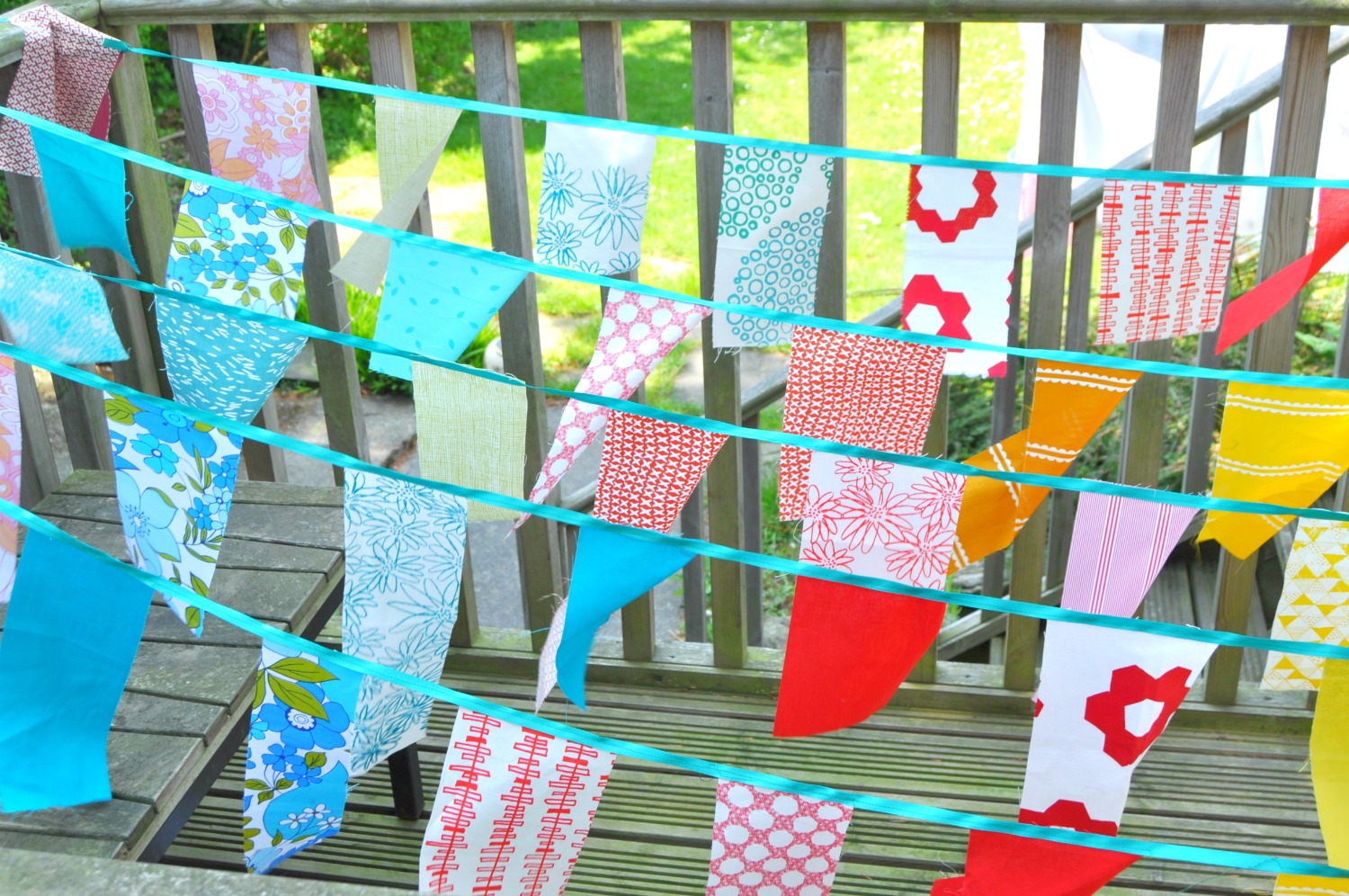 Despite having several buntings that I have made over the years I had in my head that I wanted rows of them high up criss crossing across the driveway, rather than simply strewn across the fence or hedge or the like, which is what I usually do.