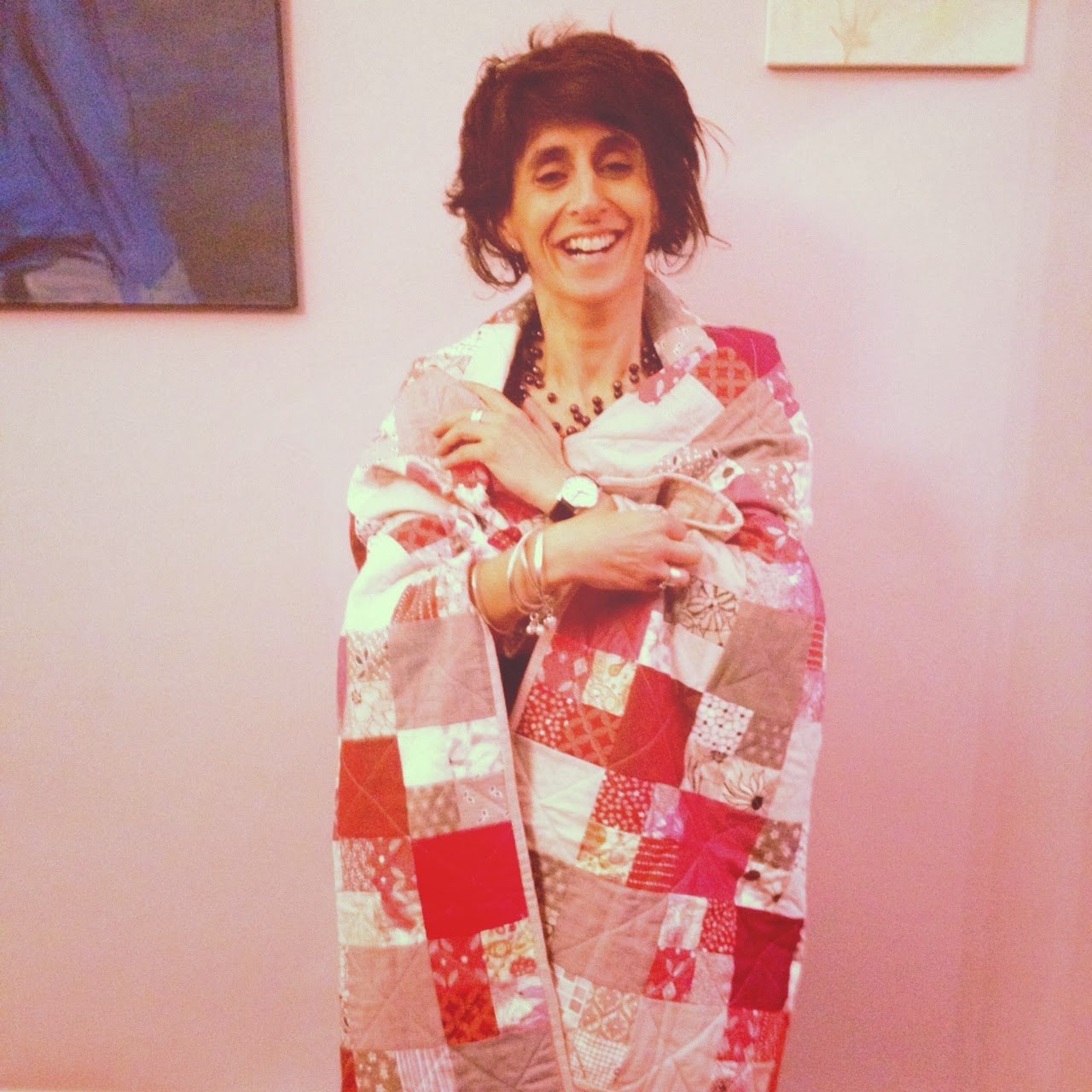 it was my sister's 50th last week and the quilt was gifted last friday night. as you can see, she absolutely loves it...or maybe she is a good actress. either way it was a success and i was ready to move on to the next...