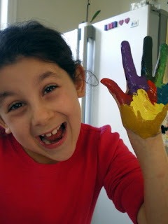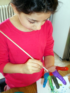 So, when she is told 'Okay, lets', she takes the bull by the horns and goes gung ho into paints. And when the fingers start to be applied with the aforementioned substance, I have to bite my lip and remind myself that this is what having kids is all about. And be grateful that what makes her happiest is spending time with me doing her favourite activity. Life doesn't get much better than that.